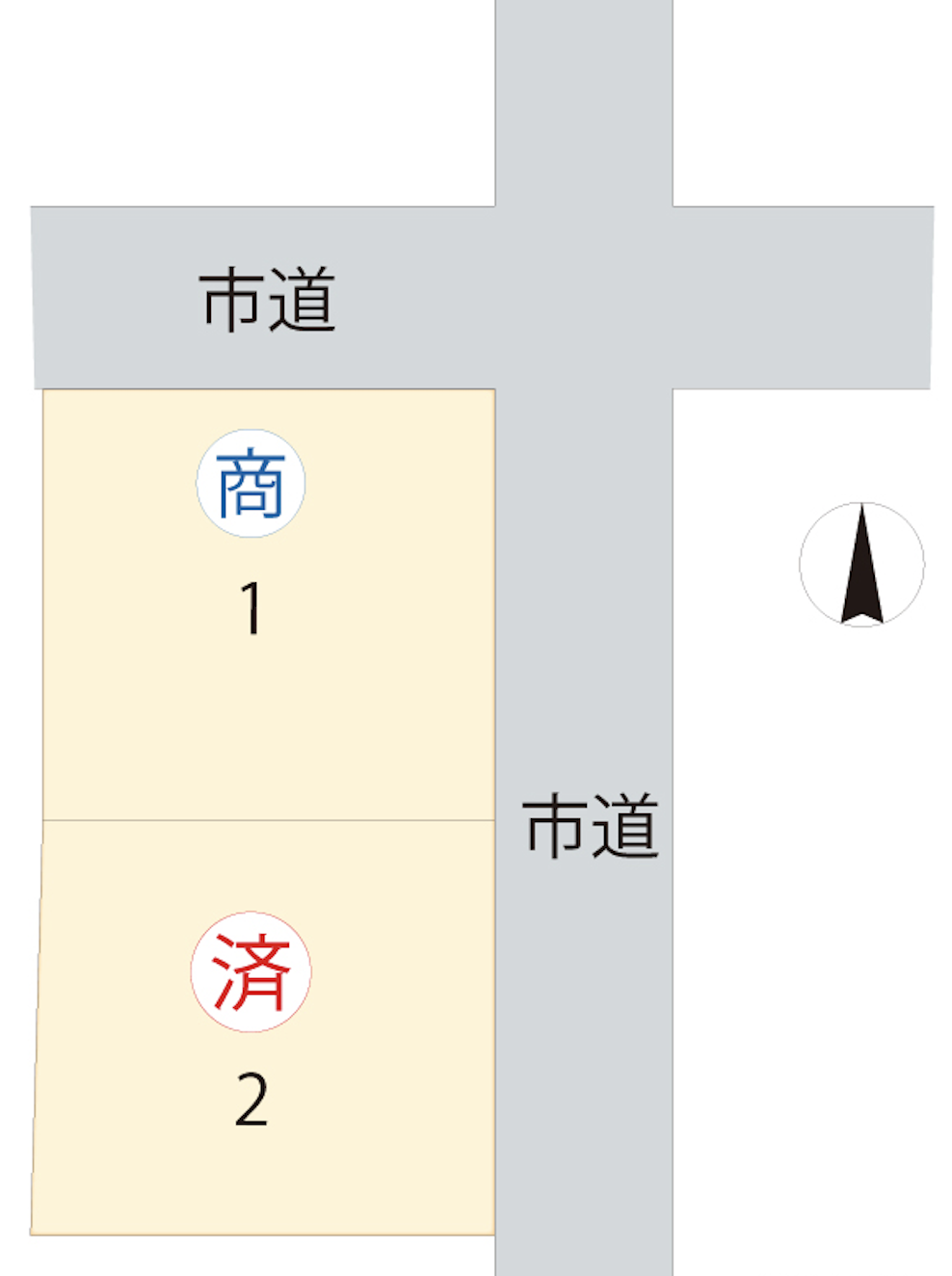 | 道路 | 1号地(角地):北側 前道4.1m/東側 前道3.9m(セットバック後)、2号地:東側 前道3.9m(セットバック後) |