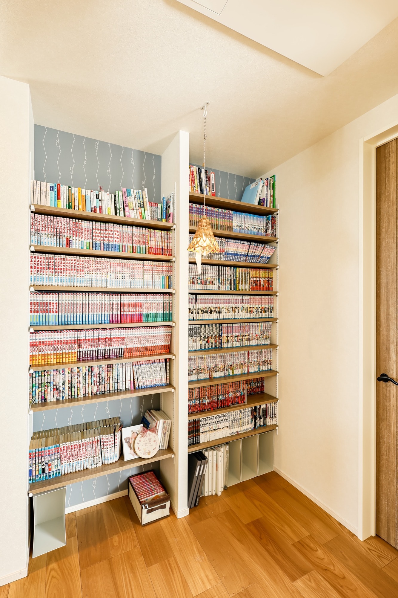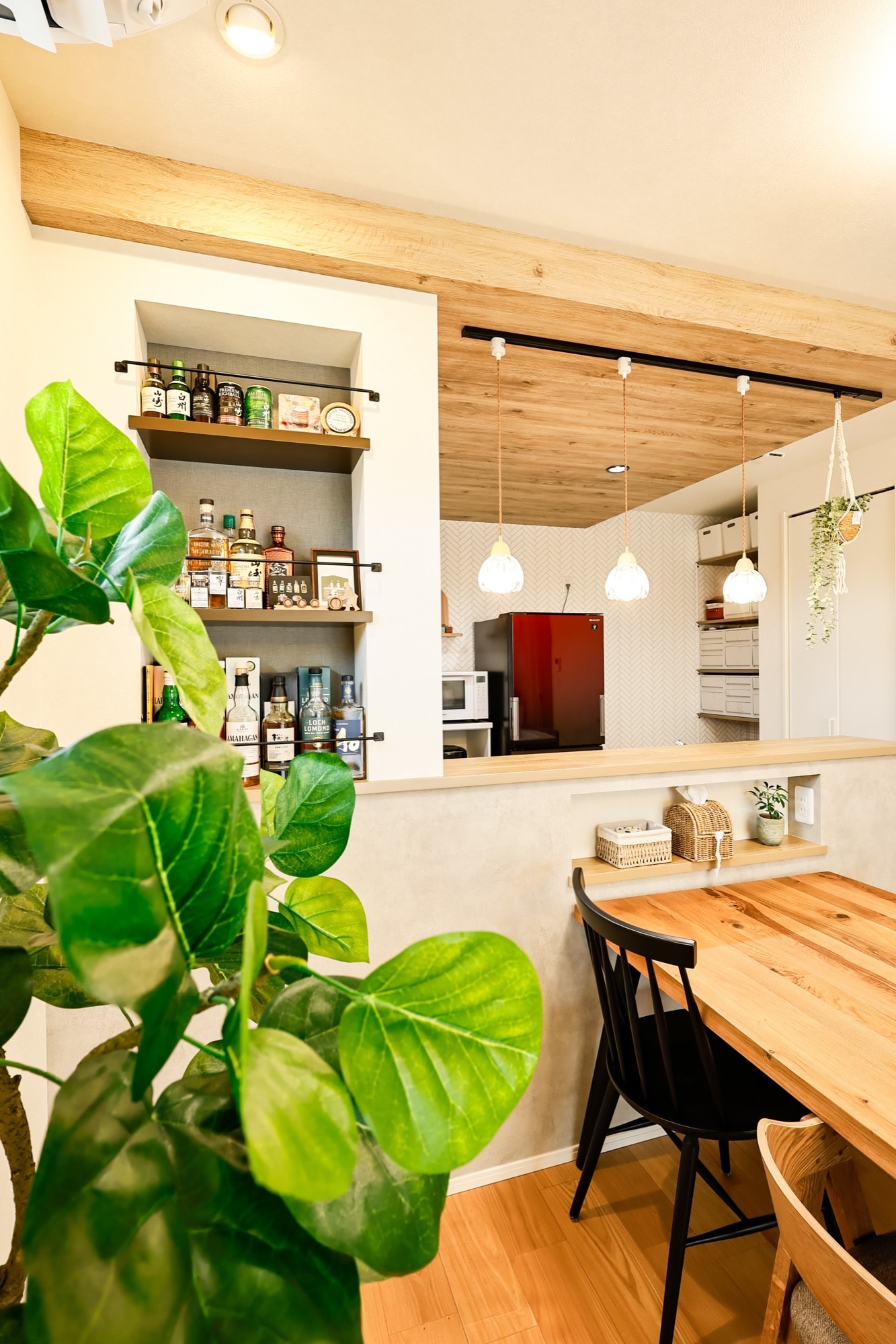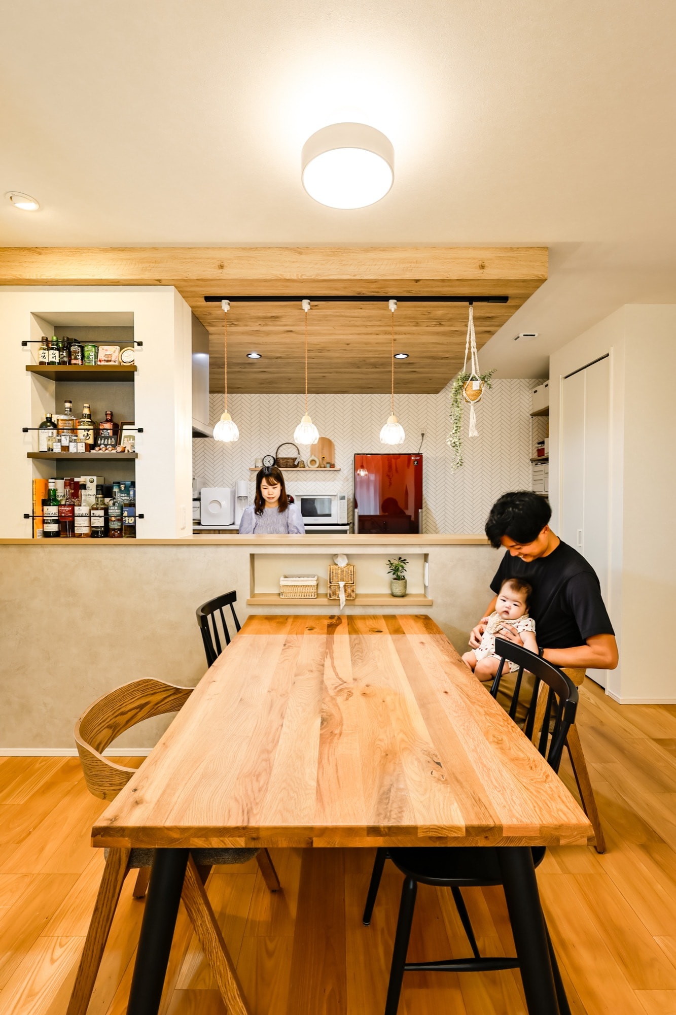 間取りでこだわられたのは、キッチンからファミリークローゼット・水まわりへと繋がる家事動線。生活のしやすさを軸にしながらも、ご主人のウイスキーコレクションを飾る棚や、奥様の本棚スペースを2階に設けるなど、“自分たちらしさ”も忘れません。