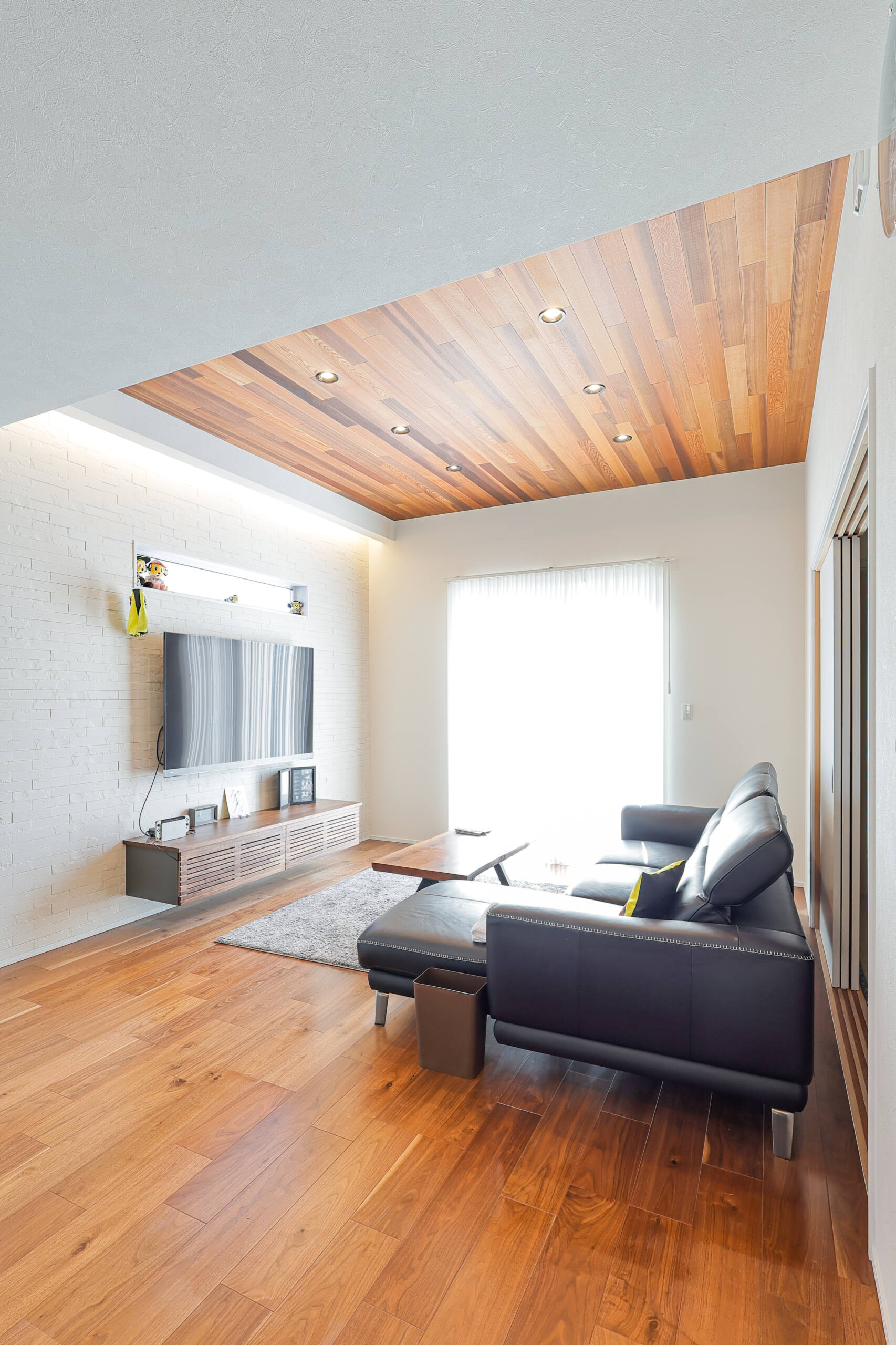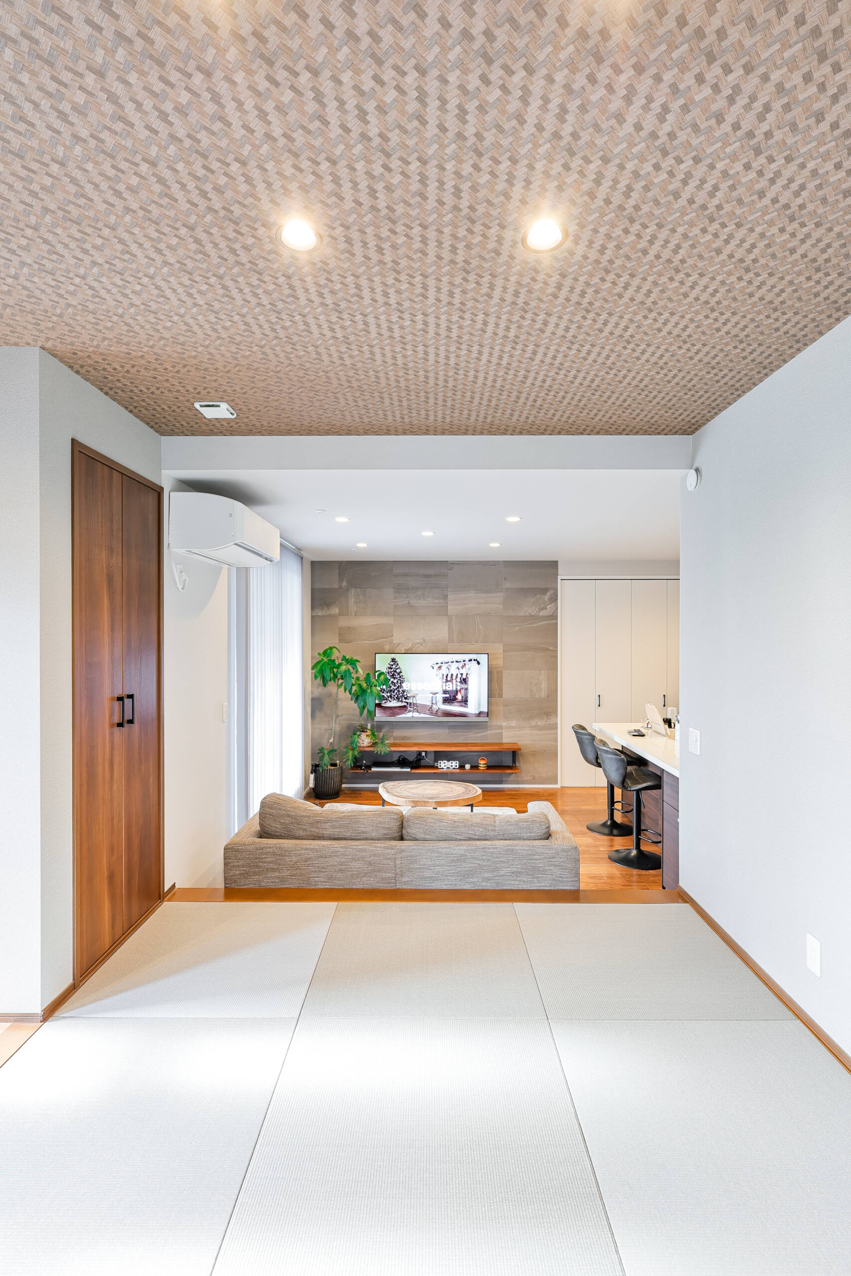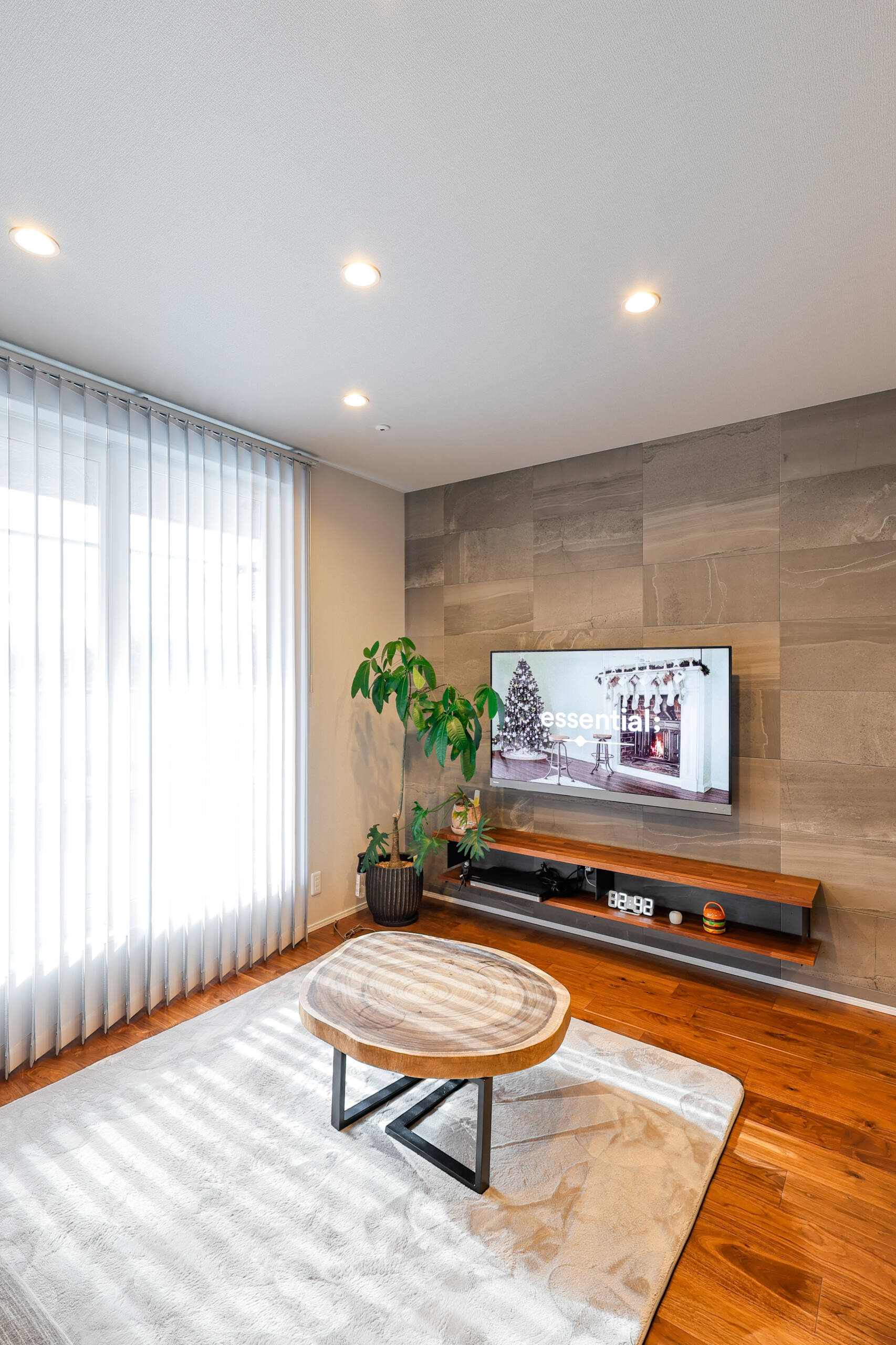 子世帯の空間はナチュラルモダンな雰囲気が広がります。テレビ背面には大判タイルを使い、空間に高級感をプラス。木目との相性も抜群です。