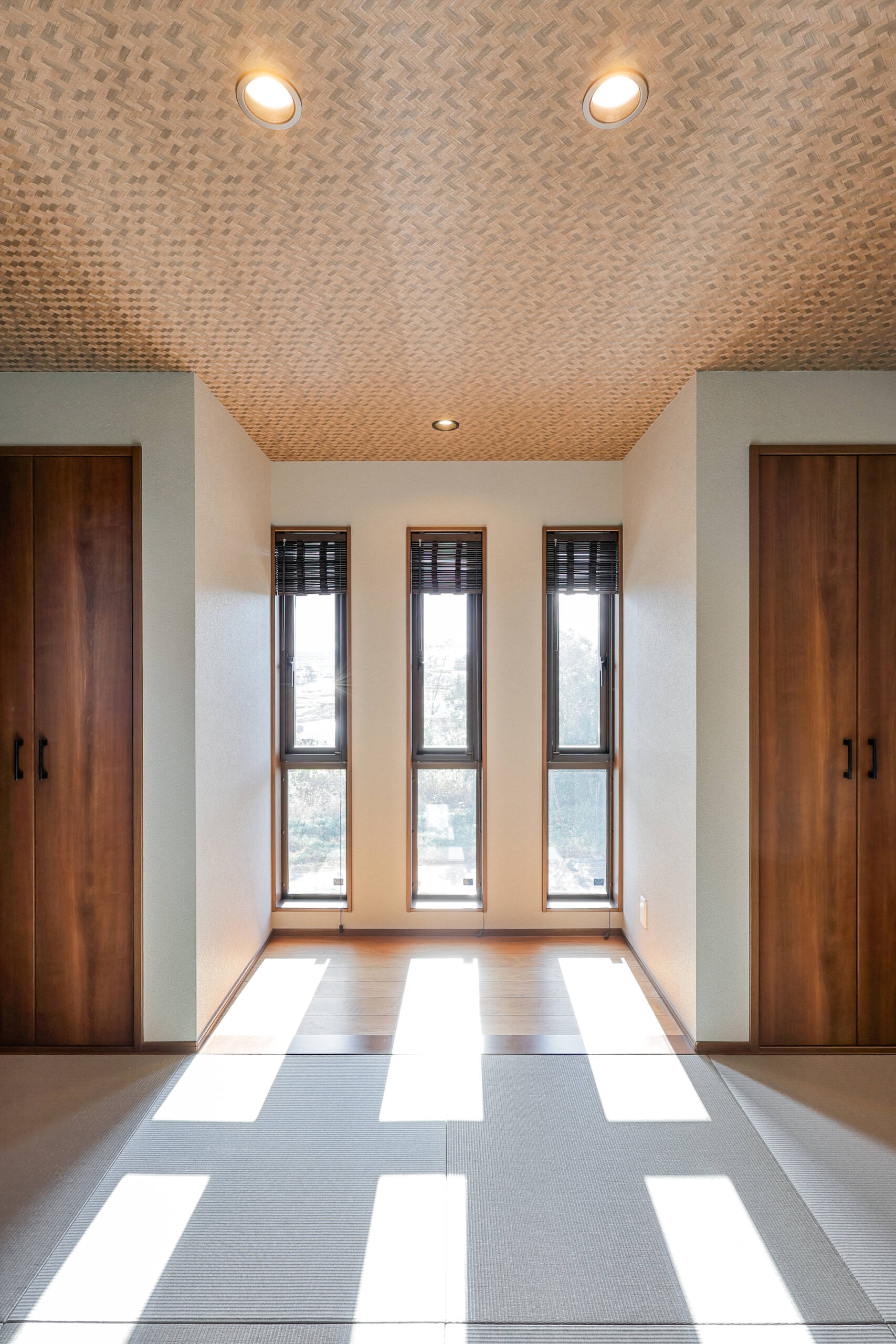 リビング続きで小上がりの和室を配置。縁なし畳と織物のような天井クロスで、現代の暮らしに合うモダンな和空間を実現。3連の縦長窓から自然光がたっぷりと差し込み、昼間は照明なしでも過ごせる明るさを確保しています。