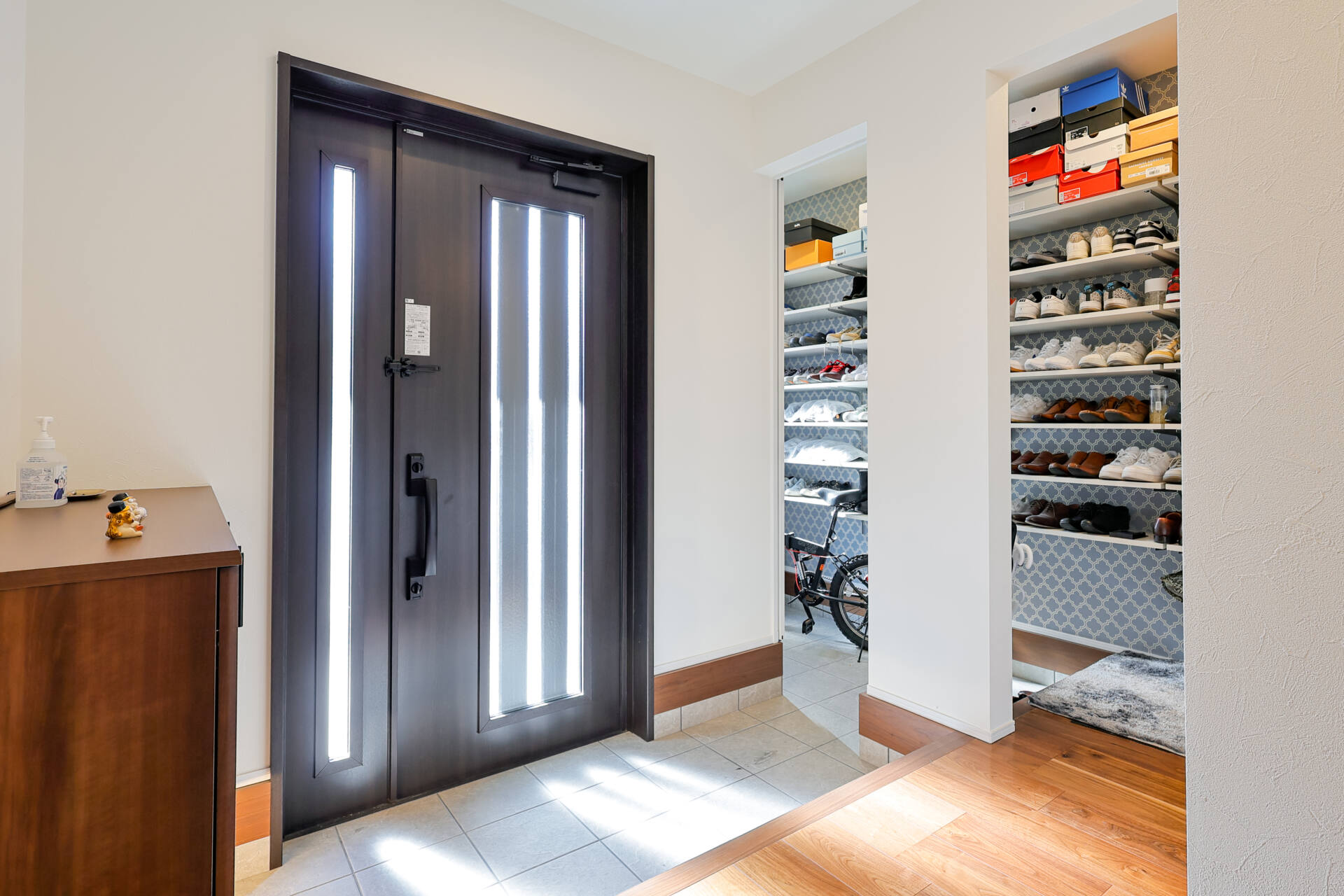 玄関を開けると目に飛び込んでくるのは、たっぷりの陽射しが差し込む明るい玄関と、靴だけでなくアウトドア用品などもすっきり収納できるシューズクローク。棚の背面に貼られたクロスがアクセントとなり、使いやすさだけでなく見た目の楽しさも演出しています。
