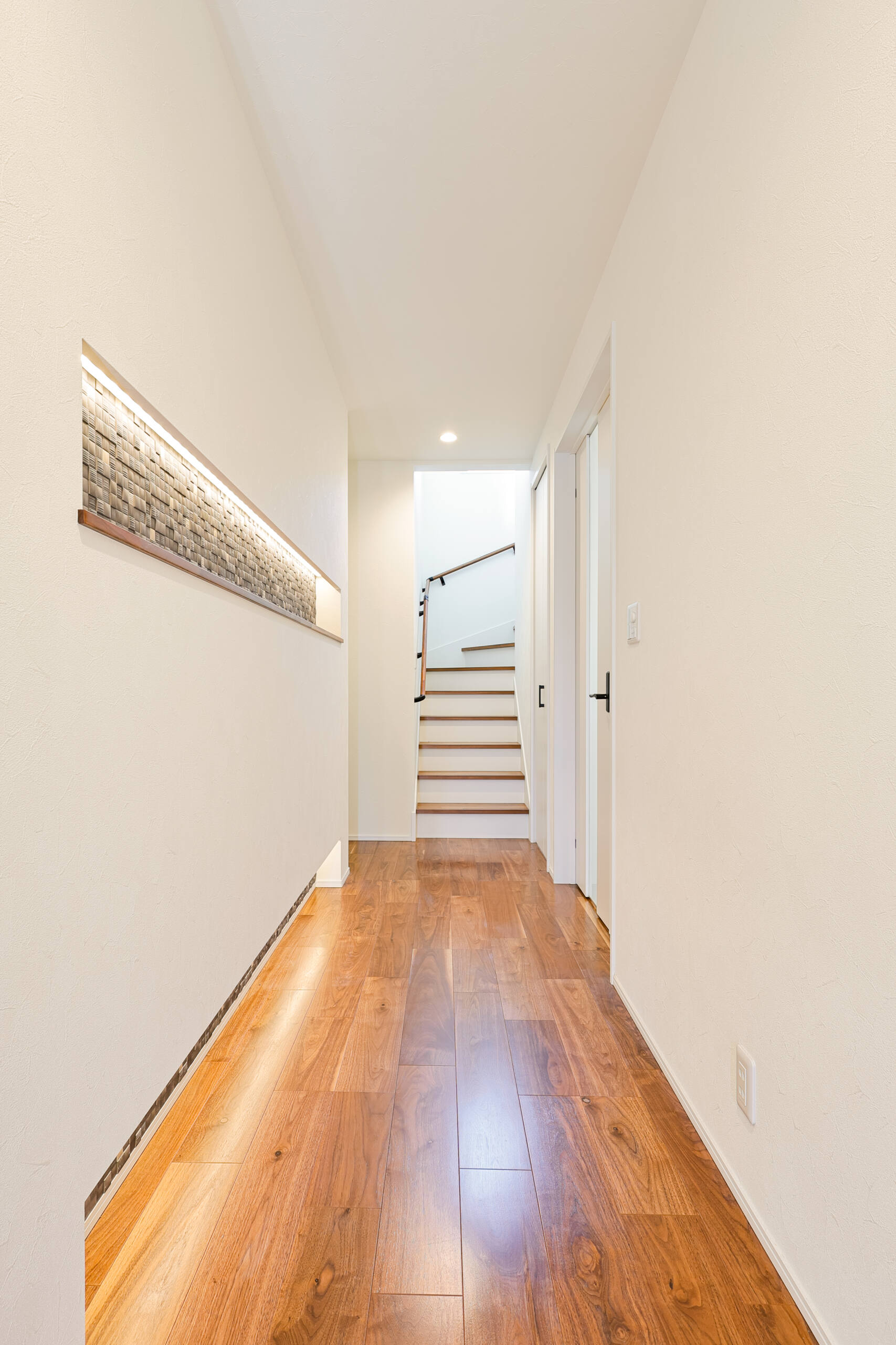 廊下には、間接照明付きのアクセントウォールを設置。やわらかな光が足元を照らし、昼夜問わず安心して歩けるだけでなく、毎日の生活動線に上質な雰囲気を添えてくれます。細やかなタイルの凹凸と陰影が美しく、通り過ぎるだけではもったいないほどのデザイン性。来客時におもてなしの気持ちが伝わるような、さりげないこだわりのひとつです。