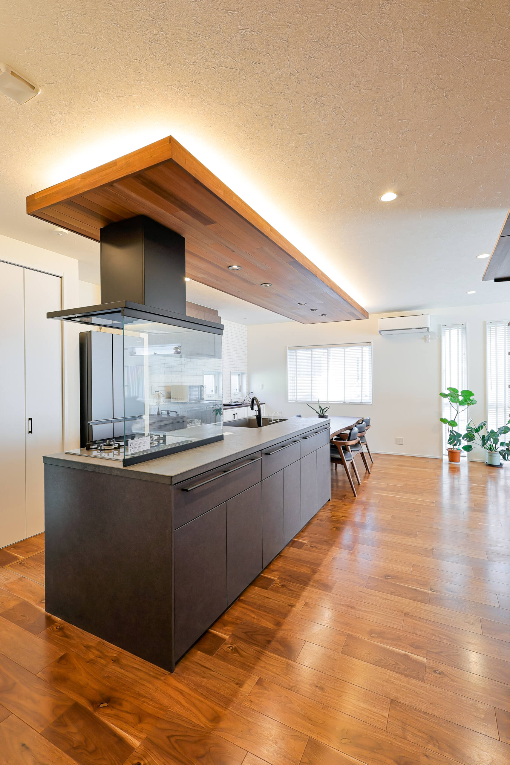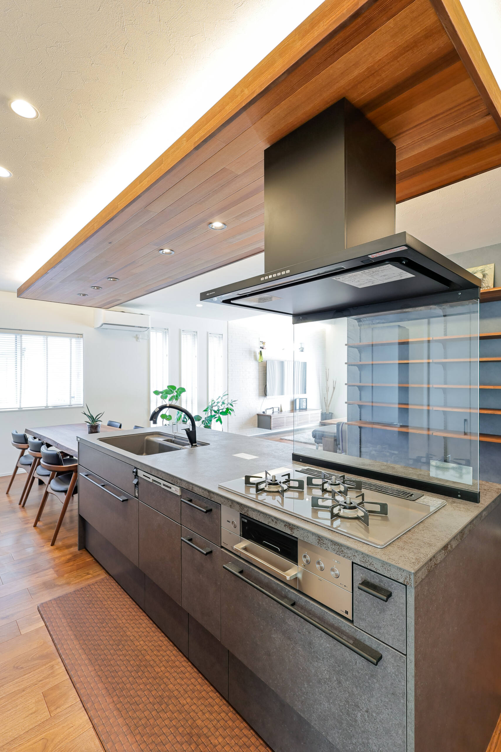 LDKは、ナチュラルな木の質感とブラックのコントラストが印象的な空間。アイランド型のキッチンは回遊性が高く、料理をしながらでも家族とのコミュニケーションが取りやすい設計。天井にも木目材をあしらい、空間に連続性とぬくもりを与えています。