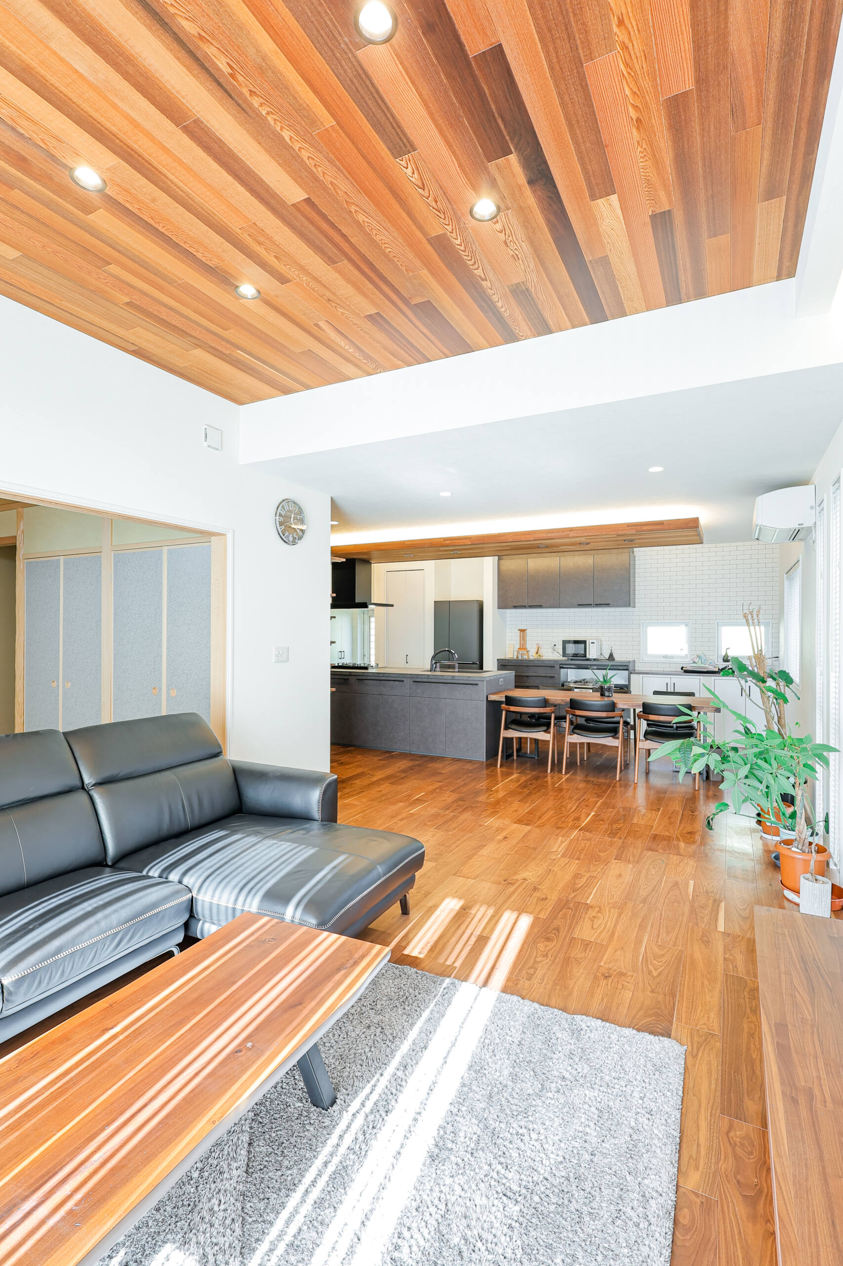 リビングはブラックレザーのソファが映えるスタイリッシュな空間。折り上げ天井に張られた木目が空間に奥行きと統一感を生み出し、上質なくつろぎを感じられる場となっています。